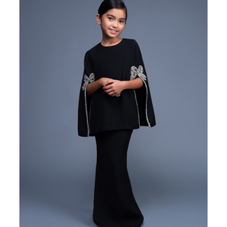 - Baju Kurung Moden ini berinspirasikan potongan capes dan berkain duyung. Ia dilengkapi dua sulaman reben comel di hujung bukaan kedua lengannya. Menggunakan fabrik RR Crepe dengan dua warna pilihan iaitu Black dan Dusty Pink.
